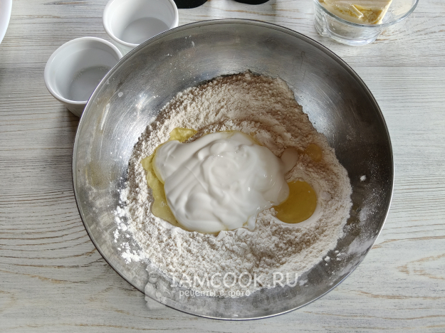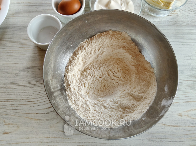 В миске перемешать муку, соль, сахар и разрыхлитель.