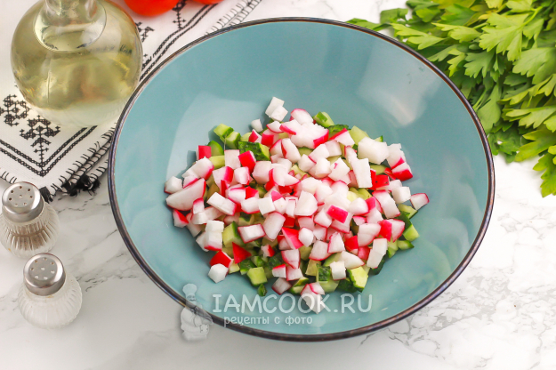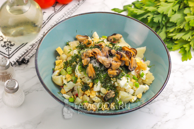 Процедите мидии от маринада или жидкости и добавьте к остальным ингредиентам. Посолите и поперчите. Аккуратно перемешайте. В таком виде нарезки можно хранить около 2 суток в холодильнике.