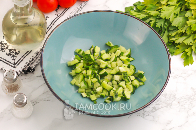 Промойте огурцы и редис, срежьте хвостики. Нарежьте огурцы мелкими кубиками и насыпьте нарезку в салатник, глубокую миску. По желанию сначала можно срезать с огурцов кожуру.