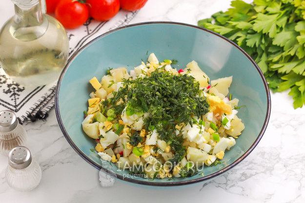 Заранее отварите куриные яйца в течение 12 минут, а картофель - 25 минут, и охладите.