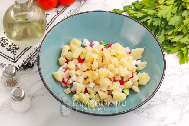 Счистите кожуру с отварного картофеля, промойте его и нарежьте мелкими кубиками.