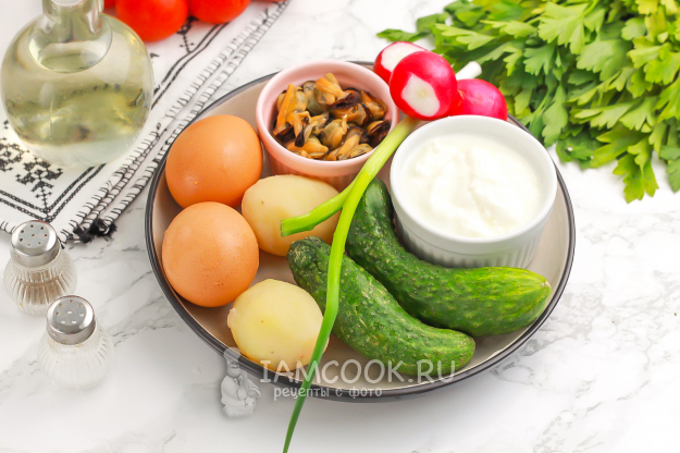 Продукты для приготовления окрошки с мидиями - перед вами!