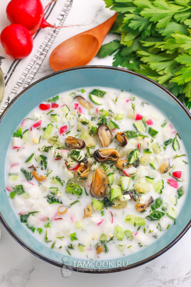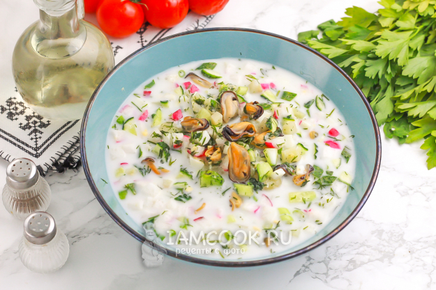 При подаче смешайте сметану любой жирности с минеральной или отфильтрованной холодной водой и уксусом (лимонной кислотой), залейте заправку в миску и перемешайте. Окрошка с мидиями полностью готова!