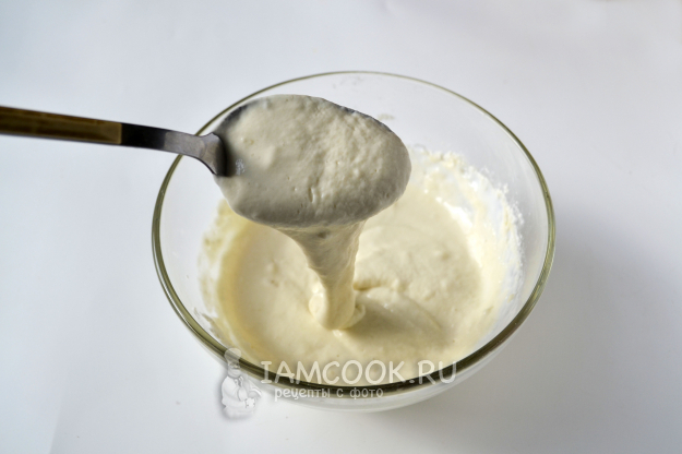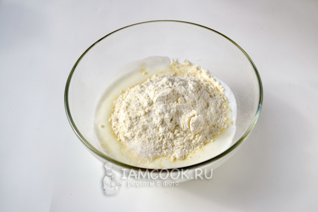 Всыпьте в кефир муку и добавьте соль. Количество муки может немного отличаться от указанного в рецептуре. Ориентируйтесь на густоту теста.