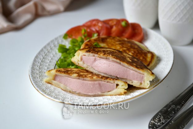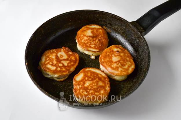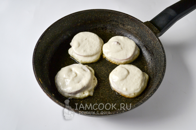 Разогрейте сковороду с растительным маслом и положите колбасу в тесте.