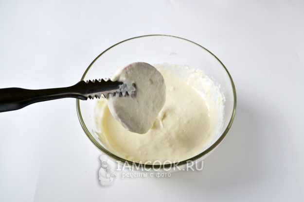 Окуните колбасу в тесто так, чтобы оно полностью ее покрыло.
