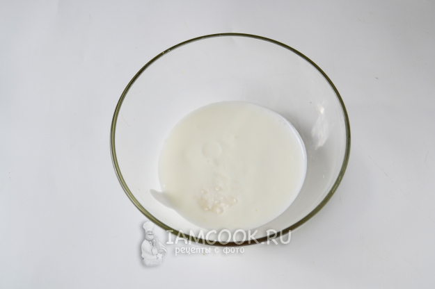 Кефир налейте в миску, добавьте соду и перемешайте. Оставьте на несколько минут, чтобы началась реакция и кефир стал воздушным.