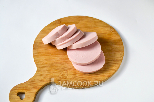 Молочную колбасу нарежьте кружочками толщиной около 1 см.