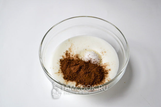 В мисочку налейте натуральный йогурт, всыпьте сахар по вкусу и какао-порошок.