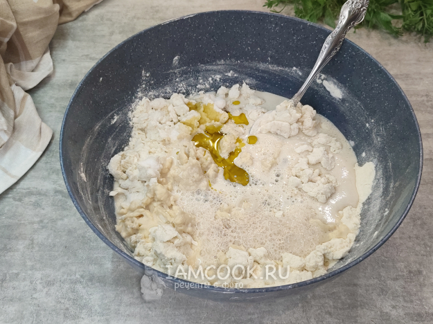 Добавляем в миску масло, соль, молоко с дрожжами и сахаром.