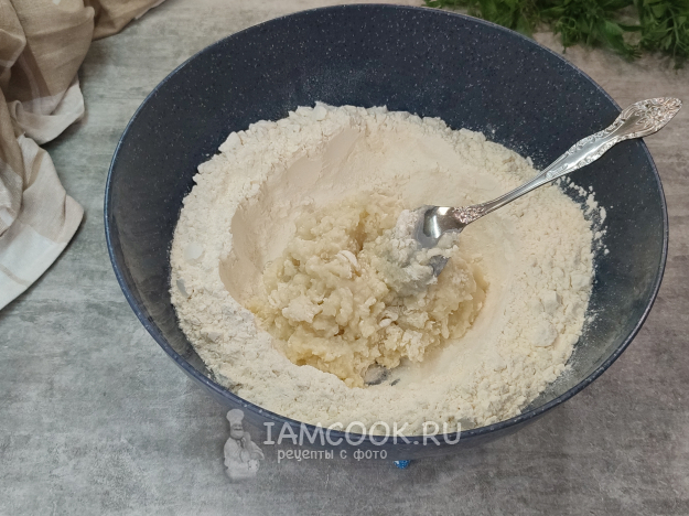 Минут через 5-7 замешайте этот заваренный комочек с остальной мукой в миске. Теперь масса не горячая, слегка теплая, можно вводить дрожжи.