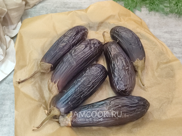 На баклажанах делаем проколы ножом в нескольких местах (чтобы его не разорвало в духовке), отправляем в разогретую до 190-200 градусов духовку минут на 30 (+/-), время запекания будет зависеть от размера баклажана. Проколите мякоть ножом, и если нож входит очень мягко - готово.