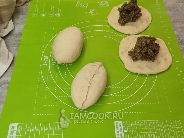 Разделите тесто на порции желаемого размера. Я не использую муку для подпыла, смазываю руки и рабочую поверхность маслом. Тесто не раскатываю скалкой, растягиваю просто руками, края лепешек делая потоньше. Формуем пирожки.