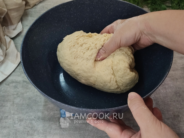 В конце замеса миску смажьте слегка маслом, уложите тесто, накройте крышкой (или пленкой), оставьте отдохнуть и подняться в теплом месте. Время подъема зависит от температуры в помещении, у меня тесто подошло минут за 30, после подъема его обминаем и даем подняться еще раз.