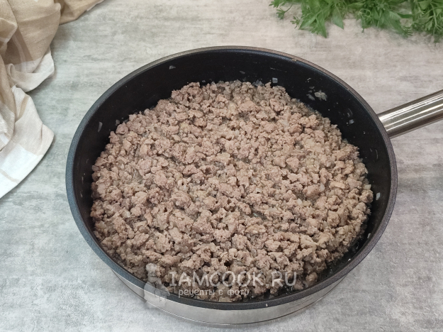 Добавим фарш, обжарим до изменения цвета.