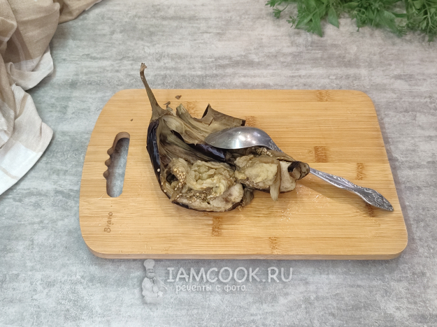 Чуть остывшие баклажаны разрезаем вдоль и вычищаем ложкой мякоть.