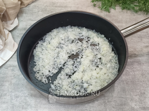 Пока отдыхает тесто, приготовим начинку. В сковороде с разогретым маслом обжарим до прозрачности лук.