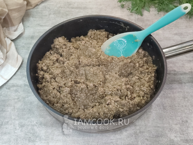 Добавляем баклажаны к фаршу, обжариваем все вместе пару минут, солим, перчим по вкусу. Начинка готова, даем ей остыть до комнатной температуры.
