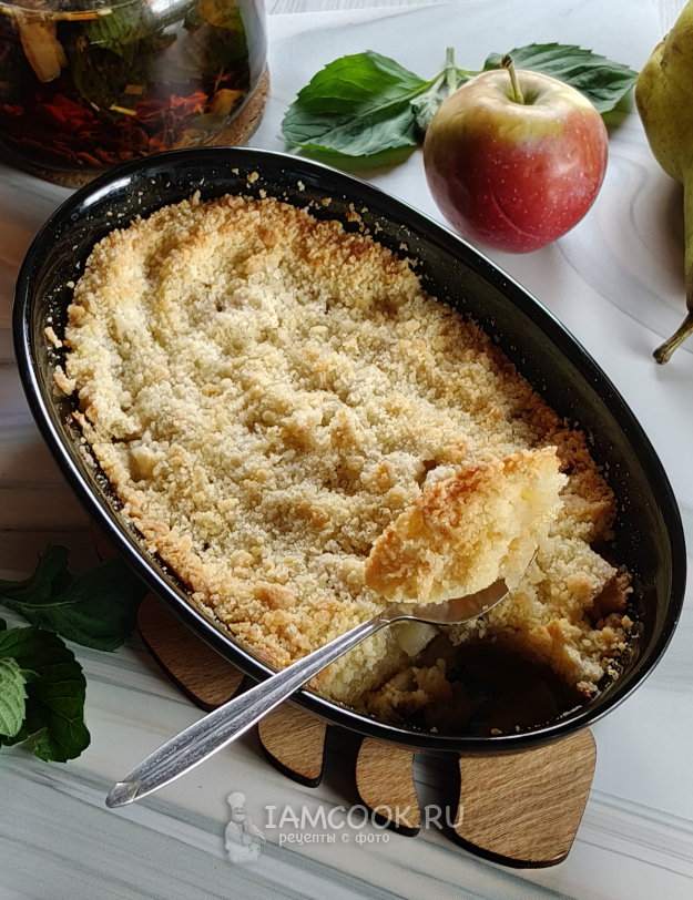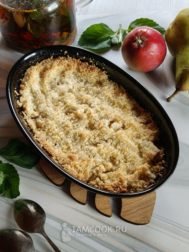 Яблочно-грушевый крамбл можно подать в горячем виде с шариком ванильного мороженого.