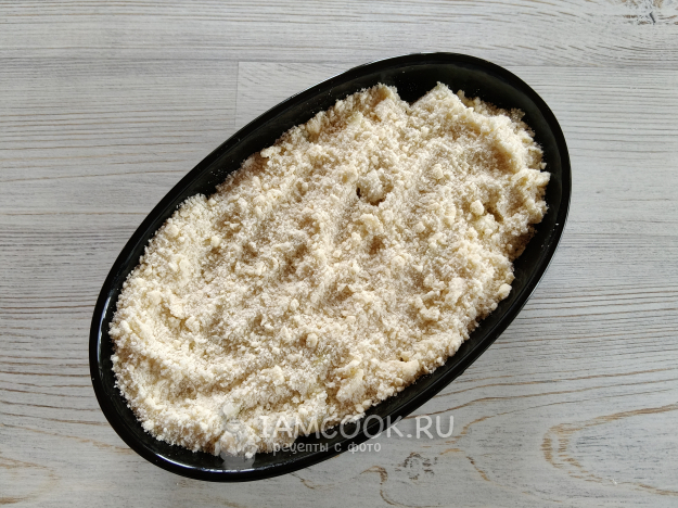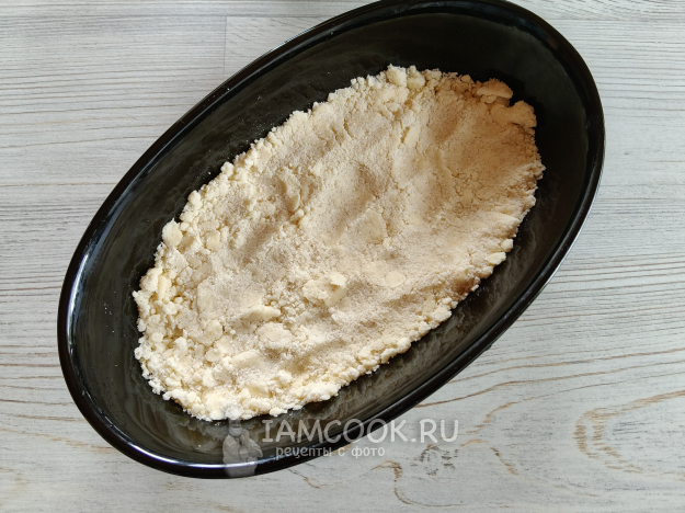 В небольшую форму для запекания выложить половину крошки, слегка придавить.