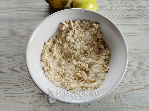 Перетереть до состояния крошки муку, сахар, масло, щепотку соли.