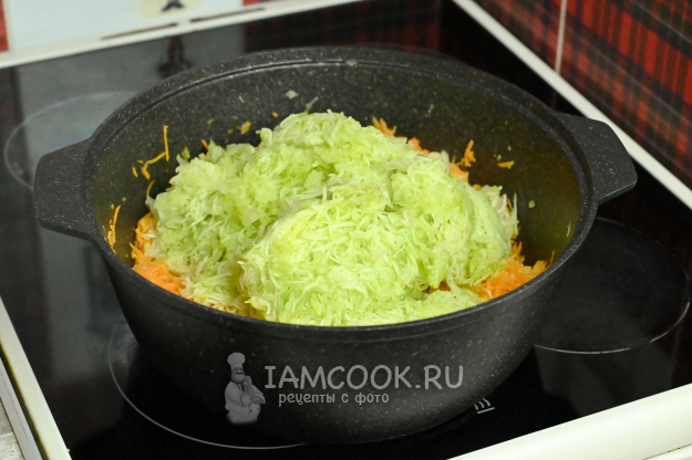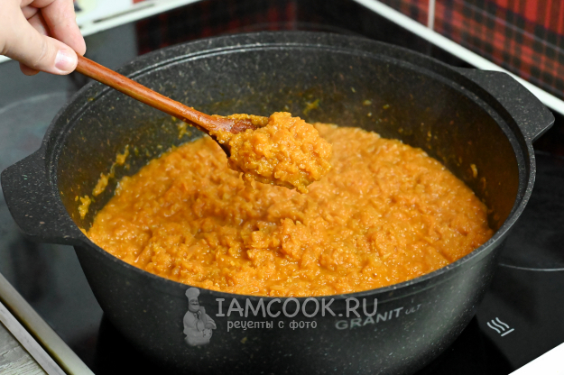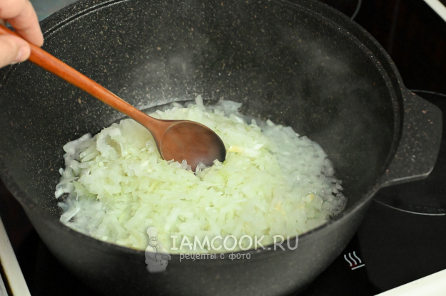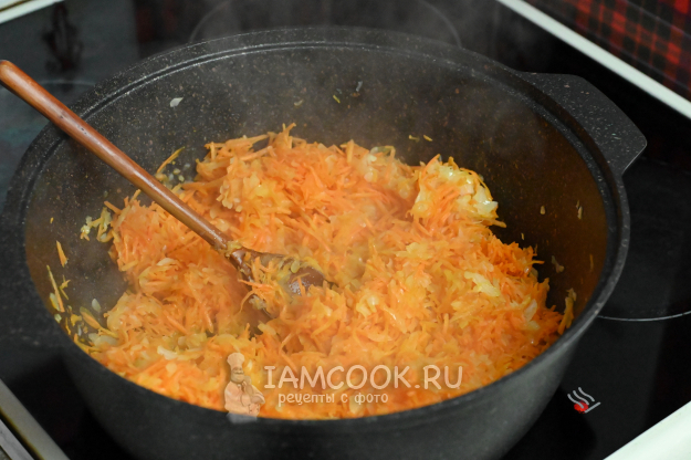 Отправьте в казан натертый лук, обжаривайте его 1-2 минуты.