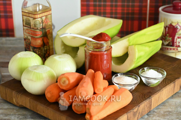 Подготовьте все необходимые продукты для консервирования кабачковой икры на терке на зиму.