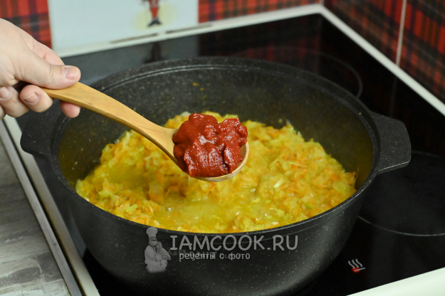 Через полчасика, когда овощи немного утушатся, добавьте томатную пасту, перемешайте и продолжайте тушить еще около 30 минут, чтобы икра разварилась и приобрела характерную консистенцию.