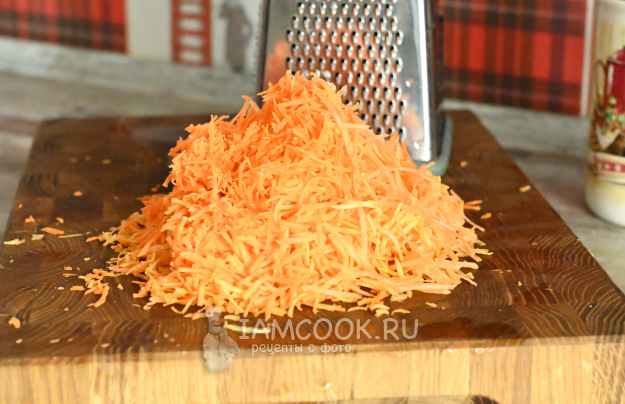 На мелкой терке натрите морковь.