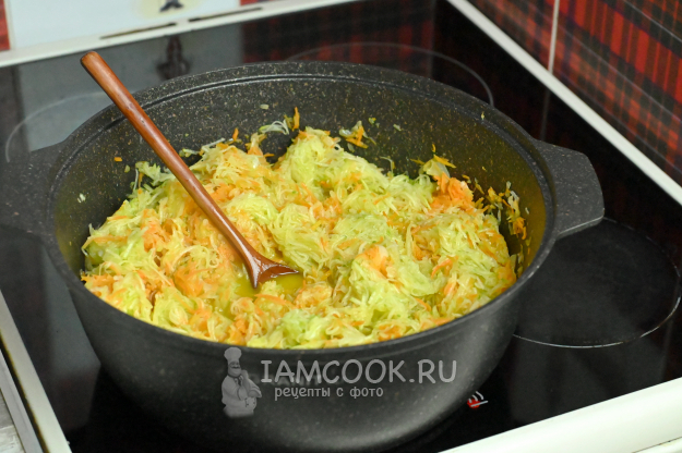 Теперь загрузите в казан все натертые кабачки вместе с соком и дайте им немножечко осесть, периодически помешивайте.