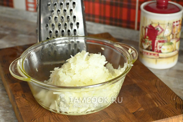 А вот лучок удобнее натирать на крупной терке. И тоже лучше сразу в миску, чтобы туда стекал сок.