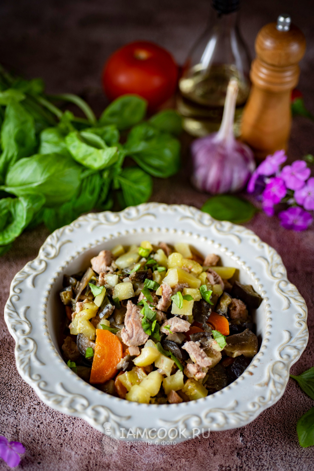 Готовое рагу со свининой раскладывайте по порционным тарелкам и подавайте к столу, присыпав мелко порубленной свежей зеленью по вкусу. Приятного аппетита!