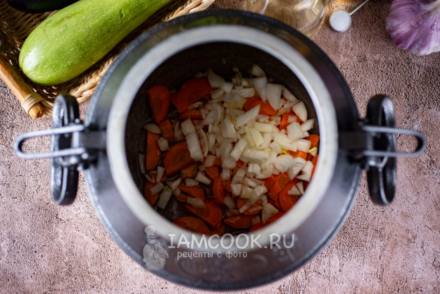 На дно афганского казана залейте растительное масло и выложите измельченные лук и морковь. Поставьте казан с овощами на средний огонь и обжаривайте, регулярно помешивая лопаткой, 6-8 минут при открытой крышке.