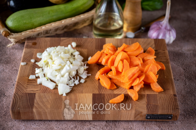 Морковь нарежьте полукружочками, нашинкуйте мелко лук.