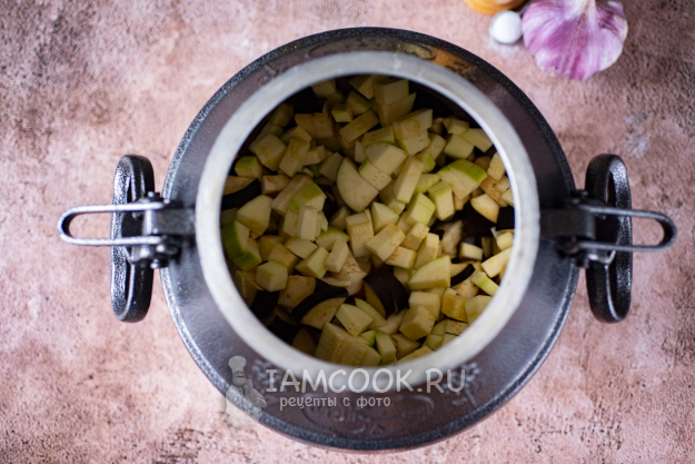 Афганский казан снимите с плиты, кабачки и баклажаны выложите в казан к луку и моркови.