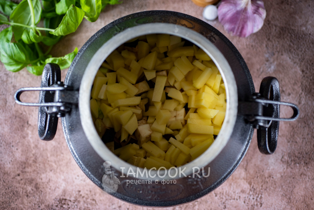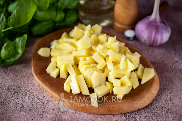 Нарежьте кубиками картофель.