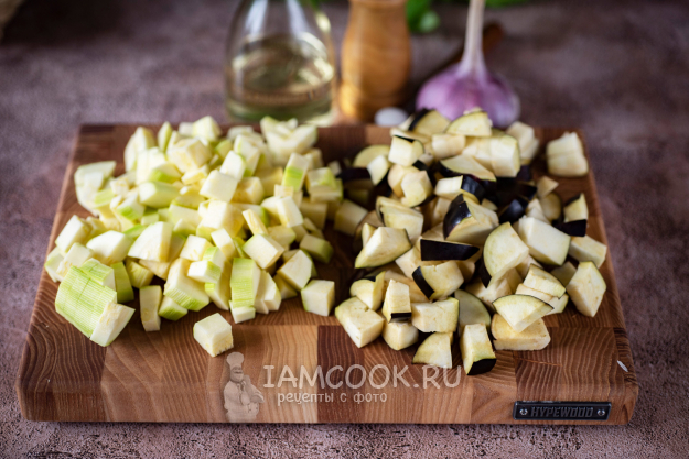 С молоденького кабачка снимите кожицу, если есть необходимость, и нарежьте небольшими кубиками. Также небольшими кубиками нарежьте баклажан.