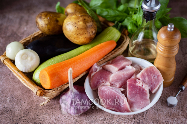 Соберите по списку все ингредиенты для приготовления рагу с мясом в афганском казане. Картофель, морковь и лук почистите и ополосните. Почистите чесночные зубчики.