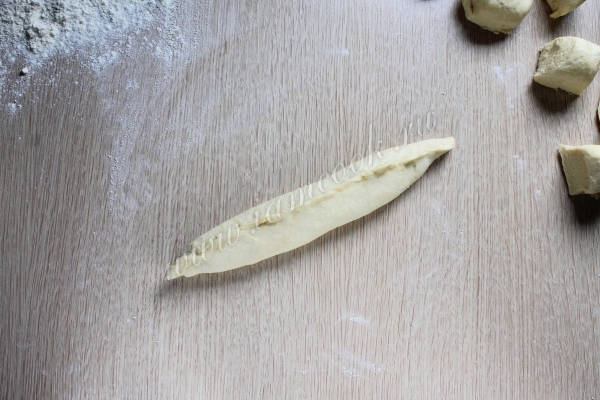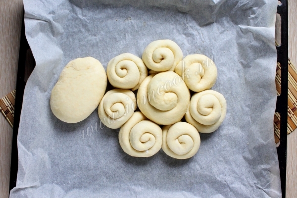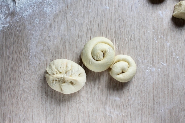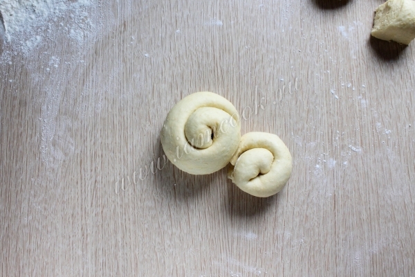 Рулетик заворачиваем улиткой, это середина туловища будет. То же самое проделываем и с 7 маленькими кусочками теста.