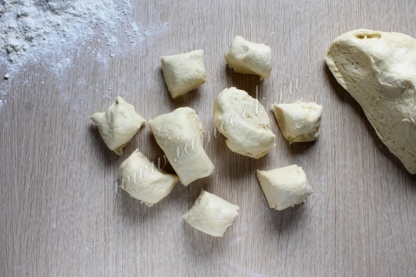 Тесто я приготовила на 1 стакан жидкости, поэтому скажу на сколько частей его нужно разделить. Половину теста делим на 2 больших и 7 маленьких кусочков как показано на фото.