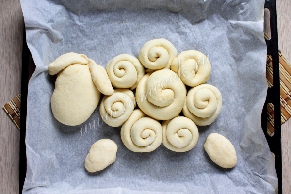 На противень застеленный пергаментом выкладываем все наши улитки и мордочку .