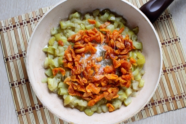 Курагу отожмите от воды, мелко порежьте и добавьте к яблокам. В начинку добавьте сахар и ванилин, перемешайте.