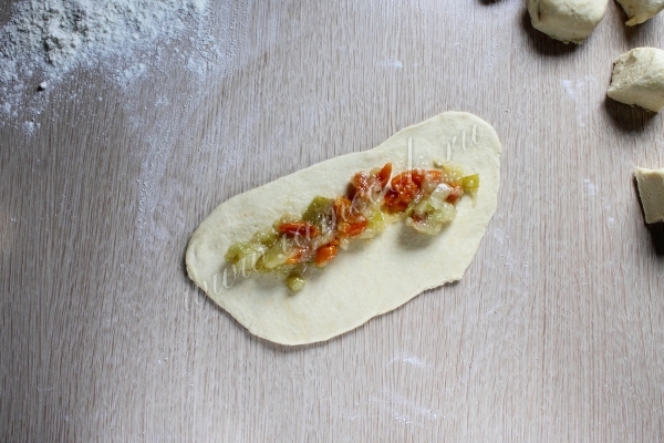 Тесто (1 большой кусочек) раскатываем в прямоугольник, раскладываем начинку.