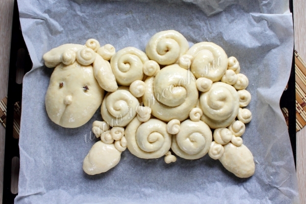 Осталось нашей овечке сделать глаза - из гвоздики и надавить тупой стороной ножа на серединку мордочки, приделываем маленький носик. Овечку смазываем яйцом, даем расстояться 20-25 минут и ставим выпекаться.