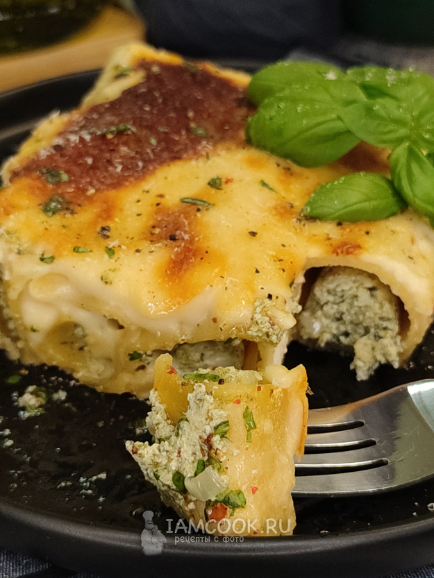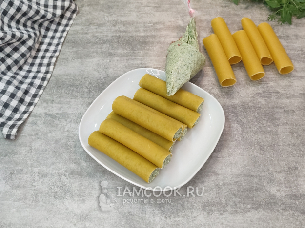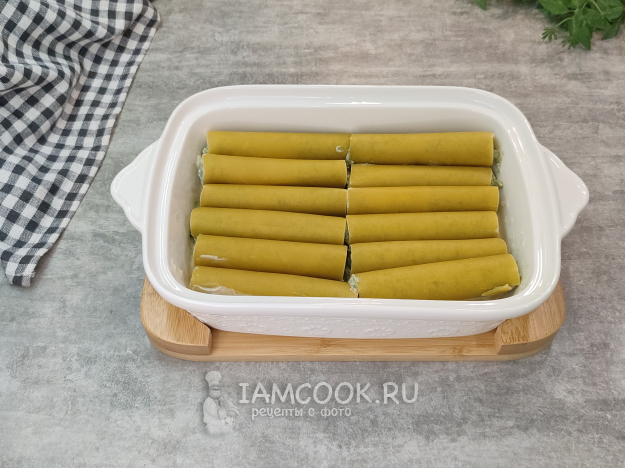 Начинку для удобства перекладываем в кондитерский мешок (или плотный пакет), фаршируем каннеллони.