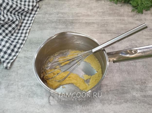 Приготовим соус. В сотейнике распустите сливочное масло, всыпьте муку, обжаривайте, постоянно помешивая, пока мука не приобретет золотистый цвет и не появится приятный аромат печенья.