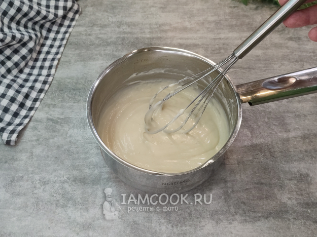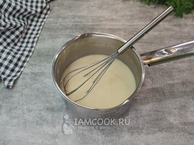 Постоянно помешивая массу венчиком, варим соус до загустения. Это происходит довольно быстро. Когда соус загустеет, добавляем сыр, перемешиваем. Когда сыр полностью растает, попробуйте соус, добавьте соли, если нужно, перец по желанию, мускатный орех. Соус готов.