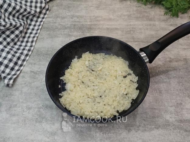 В сковороде с разогретым маслом обжарьте до прозрачности и мягкости мелко нарезанный лук и чеснок.