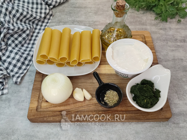 Соберите ингредиенты для приготовления каннеллони со шпинатом и рикоттой. Шпинат подойдет как свежий, так и замороженный, у меня как раз из морозилки (там он у меня есть всегда 😊).