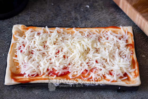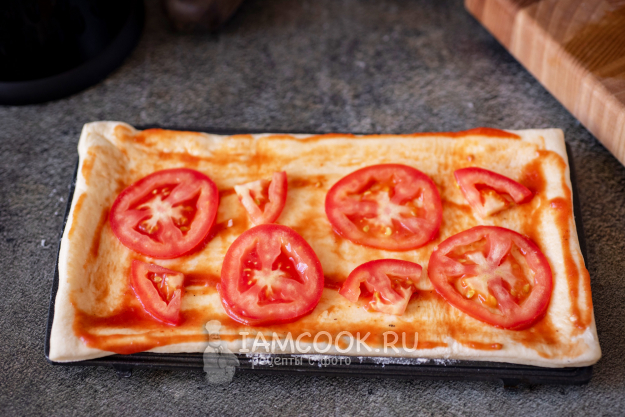 Пласт теста смажьте слоем соуса, поверх разложите кружочки томатов.